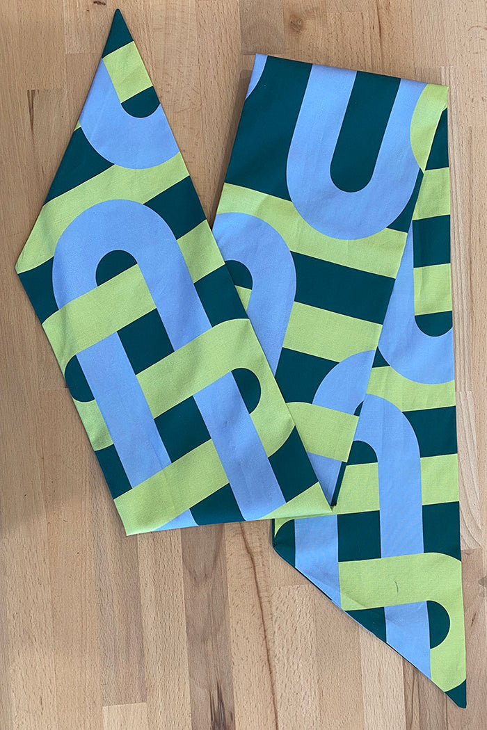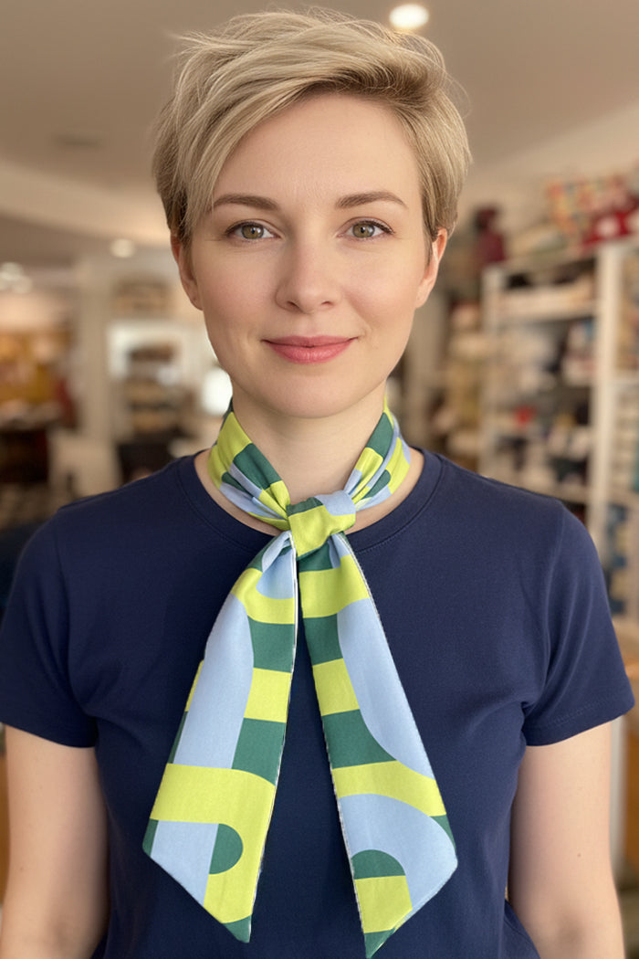 The finishing touch your outfit’s been waiting for. This limited-edition Twilly scarf in our large size is made in 100% cotton, which is in a heavier weight featuring a bold graphic print of in lime, pale blue & green. Whether knotted at the neck, wrapped around your ponytail, or tied to your tote, it adds a vibrant pop of personality to any look.