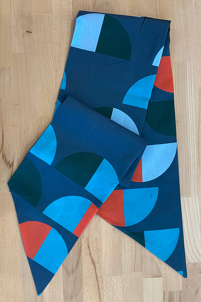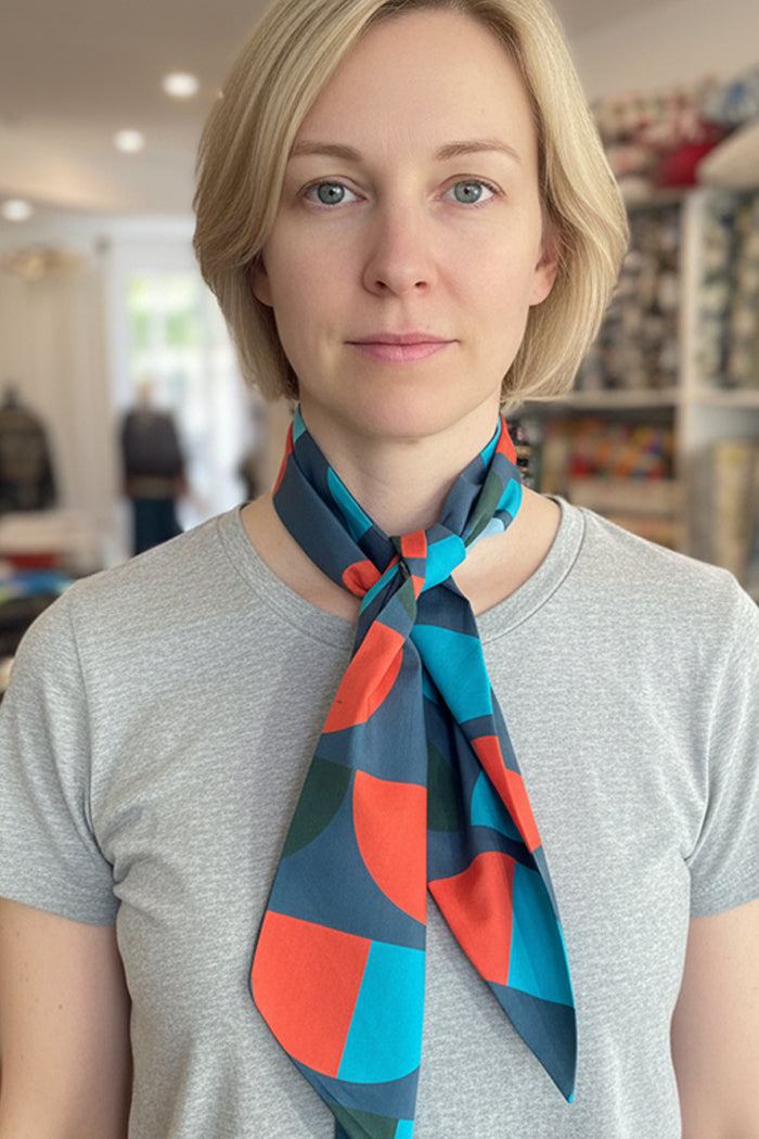 The finishing touch your outfit’s been waiting for. This limited-edition Twilly scarf in our large size is made in silk /cotton , featuring our original Surface Art Large Semi print in shades of blues & oranges. Whether knotted at the neck, wrapped around your ponytail, or tied to your tote, it adds a vibrant pop of personality to any look.
