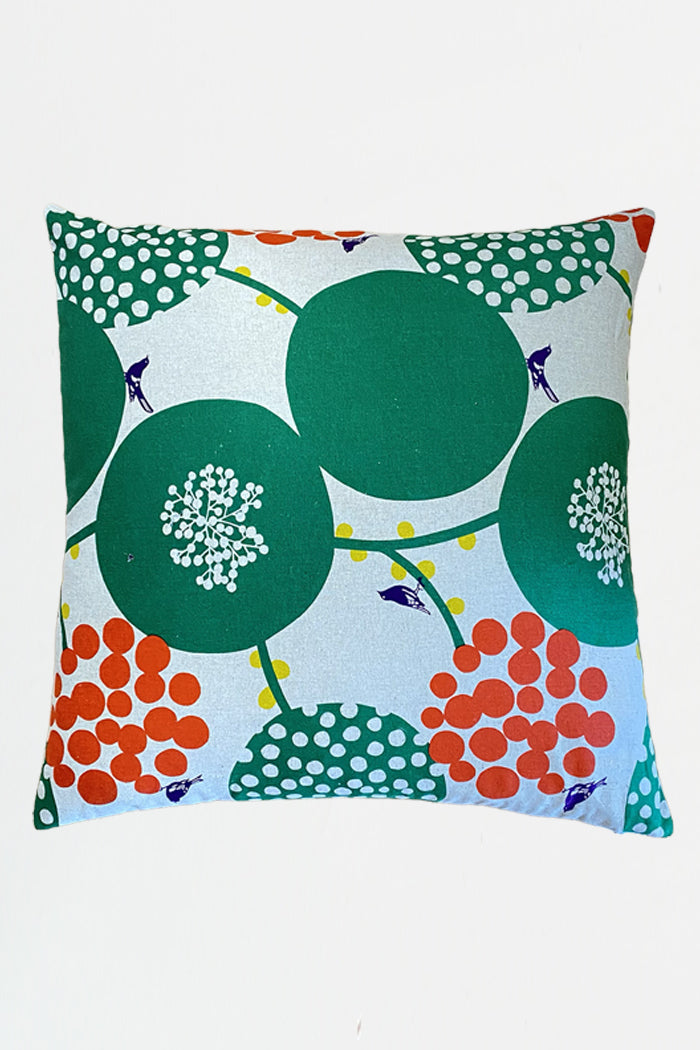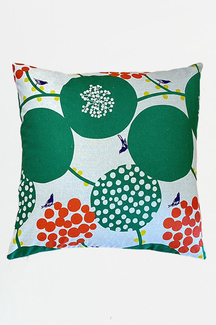 A limited-edition cushion made from Japanese linen/cotton in the bold and bright print in large green berries with red, touches of yellow with little purple birds on a natural ground. The design placement varying slightly. Finished with an invisible zip for easy laundering.