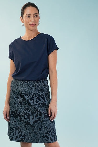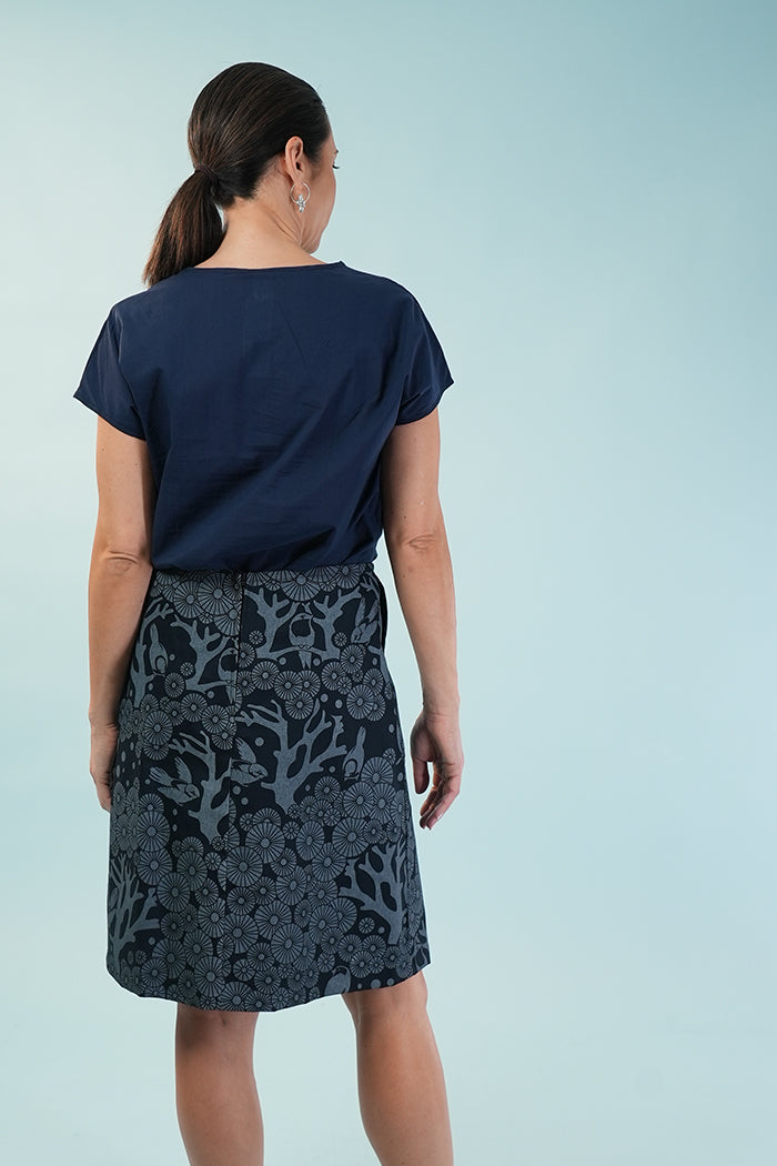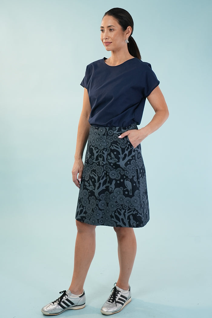 Elevate your wardrobe with the Zoe skirt in our beloved Mikko print, now reimagined in a rich dark navy (ink) with a soft white silkscreen design that reads as light grey. Made from 100% cotton drill and hand printed in Sydney ,this A-line skirt is designed for effortless trans-seasonal styling.