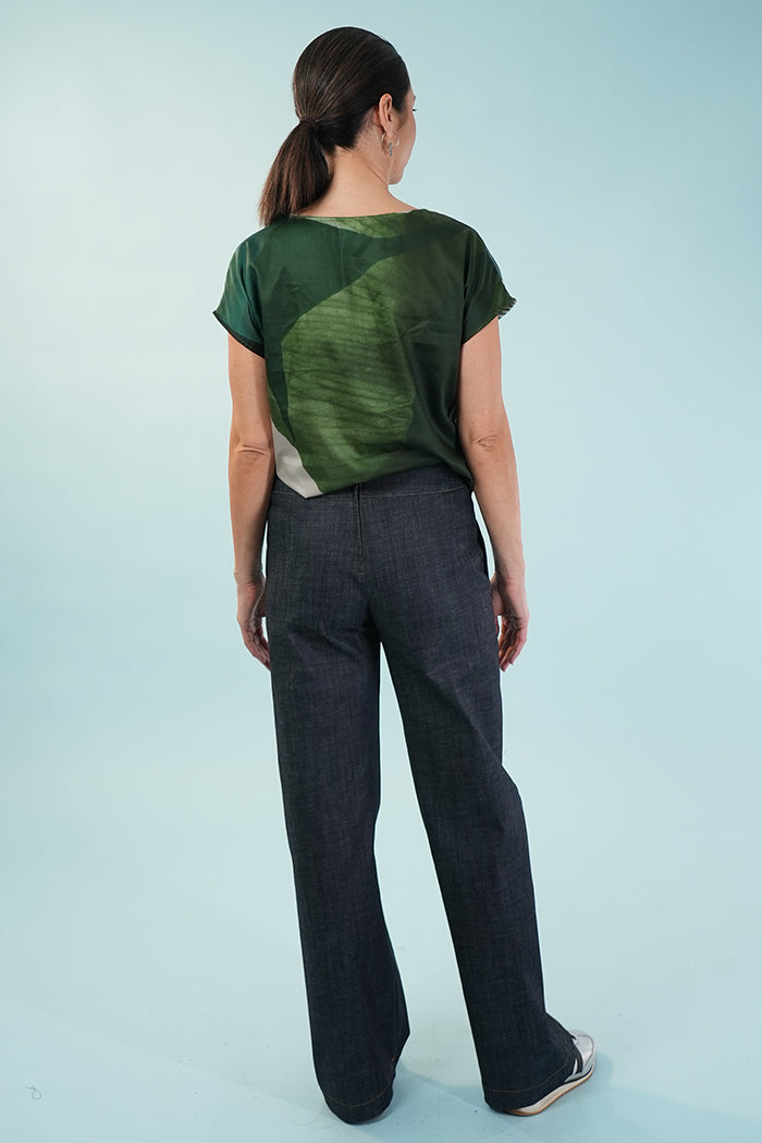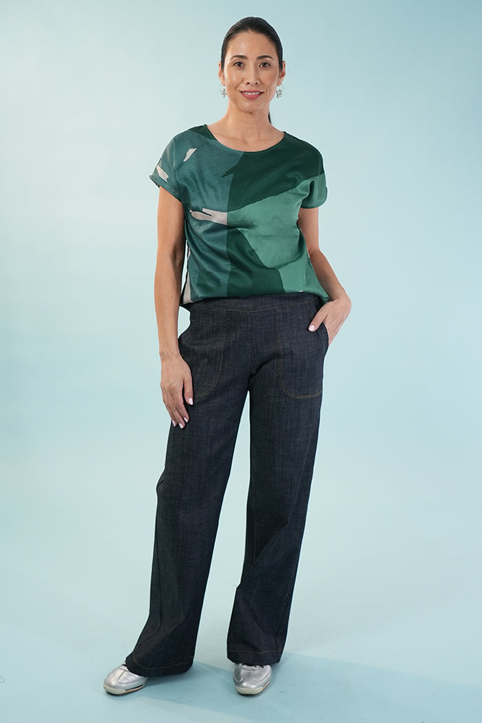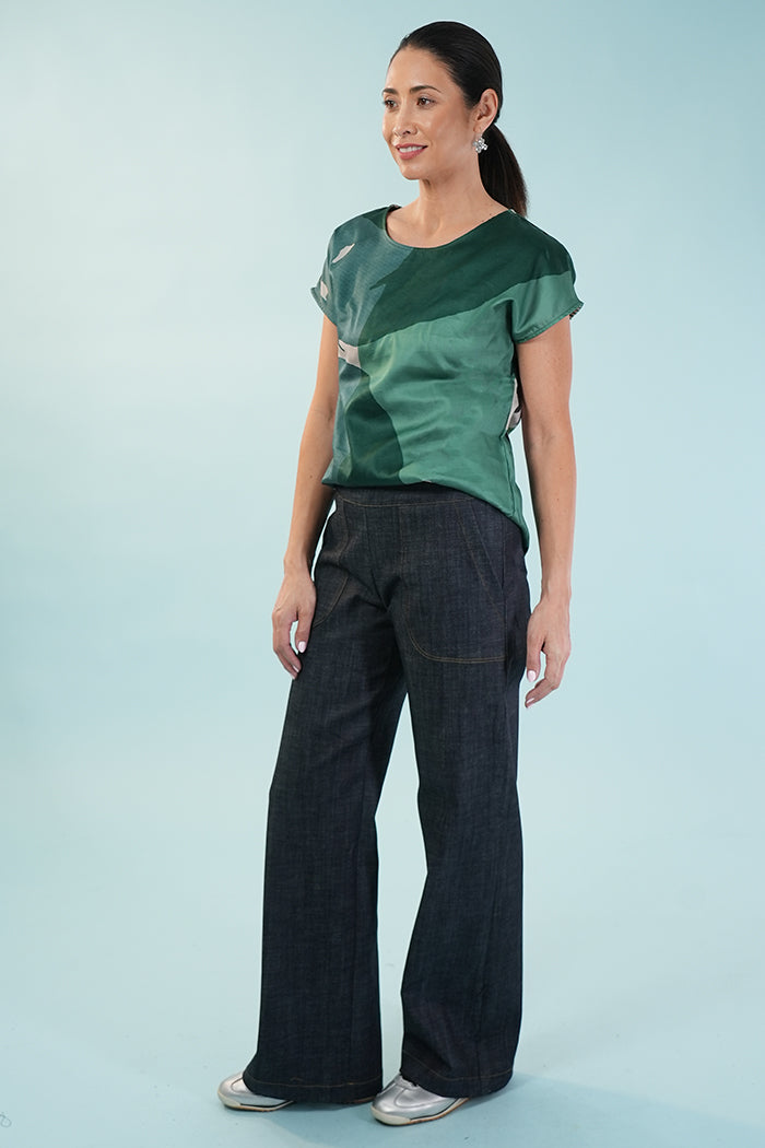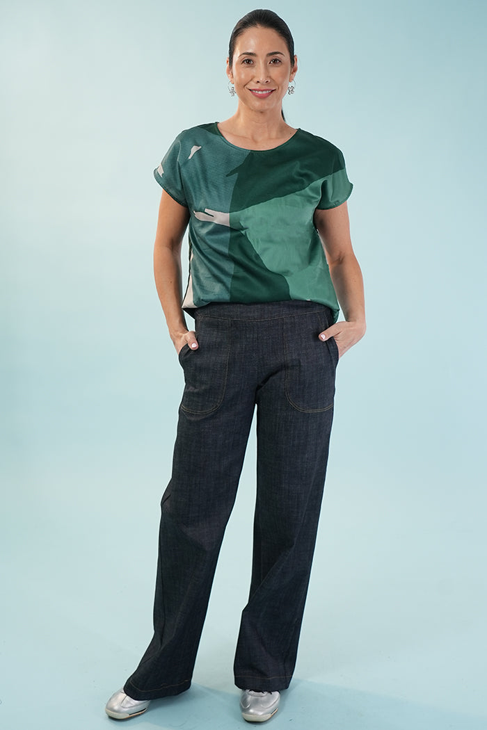 Elevate your everyday style with our Gabby Pants in heavyweight indigo stretch denim, a modern take on the classic wide-leg silhouette. Designed for comfort and confidence, these pants feature a wide waistband panel that smooths and flatters the tummy, plus a sleek back zip closure for a clean finish.