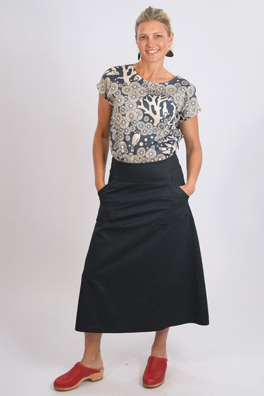 Designed for effortless transitions, the Amy Skirt combines vintage inspiration with modern versatility. Made in ink navy cotton drill, it features a flattering A-line cut, panel detailing at the waist, patch pockets, and a back zip. The midi length falls below the calf, depending on your height.
