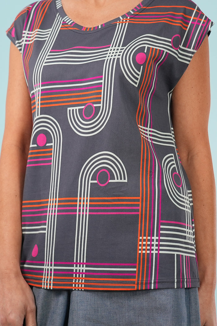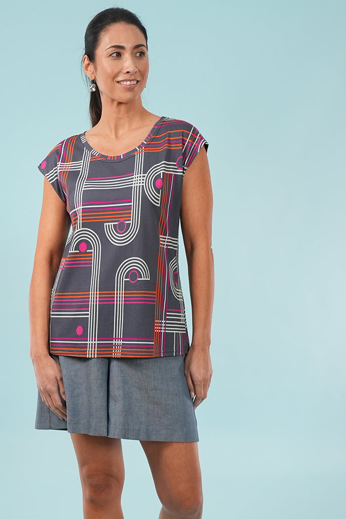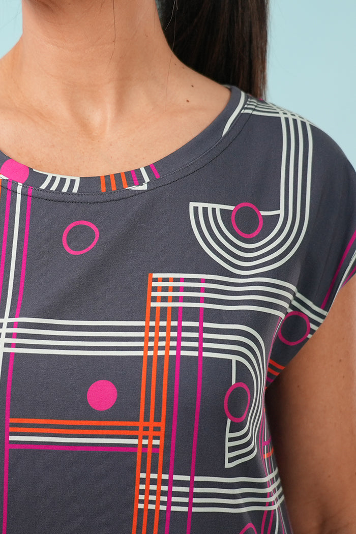 Digitally printed with our original Checkers design, a vibrant linear graphic in smoke, layered with pinks and tangerine, it’s a joyful pop of colour for your everyday wardrobe.