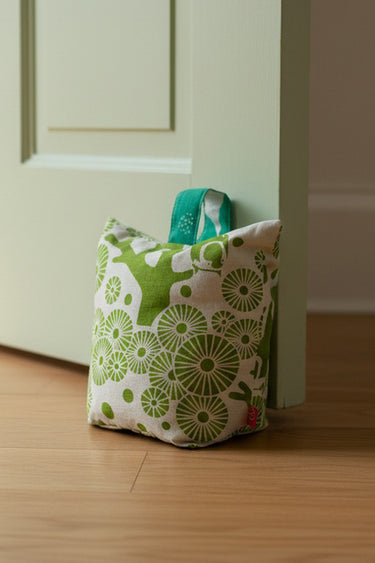 In a 100% linen, is in our original hand screen printed design Mikko in mist (aqua blue) on birch, our doorstop is a handy item for any room. The doorstop has a zip closure at the bottom and the rice filling is bagged for easy removal.