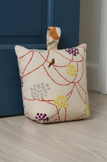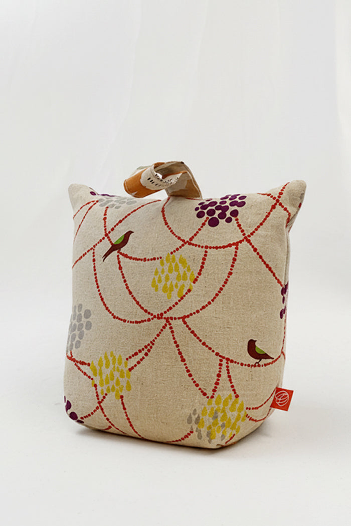 In cotton, this graphic design from Japan, this doorstop is a handy item for any room. The doorstop has a zip closure at the bottom and the rice filling is bagged for easy removal.