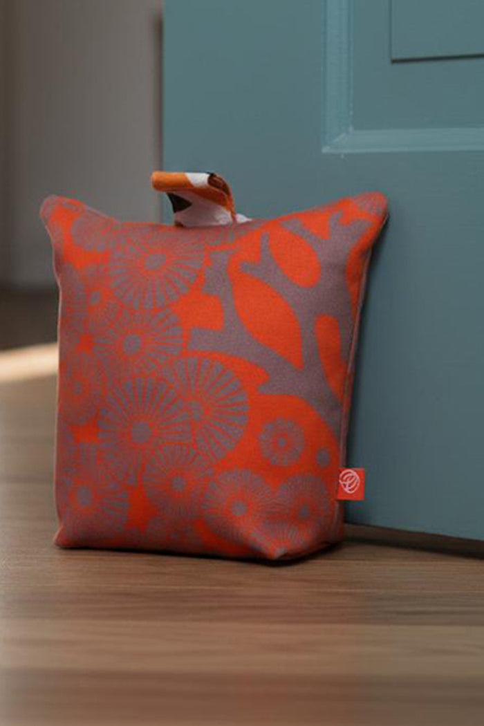 100% cotton canvas in our original Surface Art Mikko print in jaffa and putty, this doorstop is a handy item for any room. The doorstop has a zip closure at the bottom and the rice filling is bagged for easy removal.
