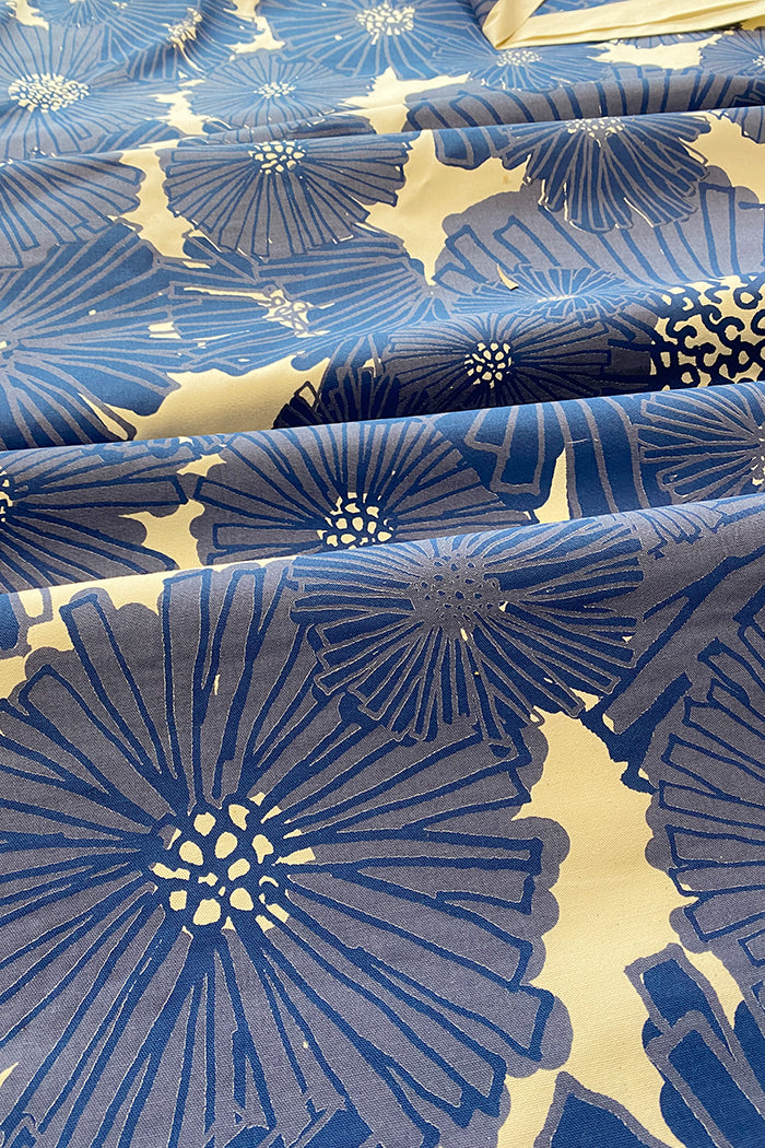 Why You'll Love It: Our Dahlia" print on 100% cotton oxford from japan in shades of blue is a bold and graphic floral design, hand screen printed here in Sydney.
