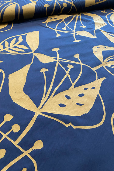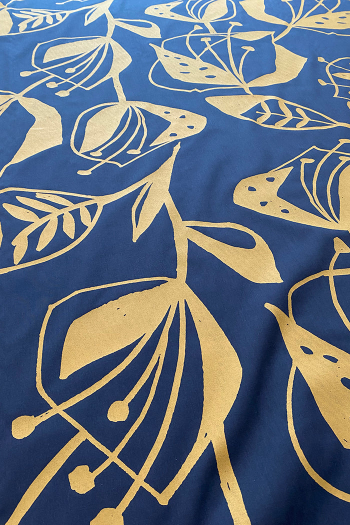 Why You'll Love It: Our Woodcut Flowers" print on our classic lightweight voile in lark on navy is a bold and graphic design, hand screen printed here in Sydney.