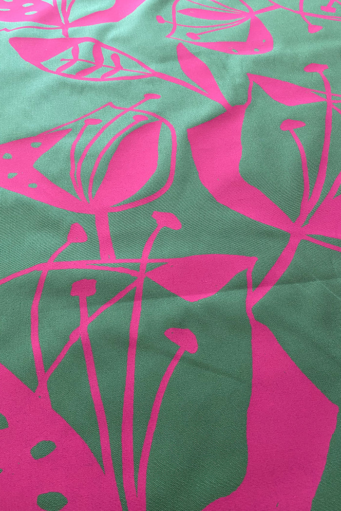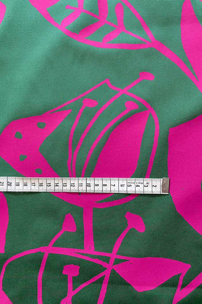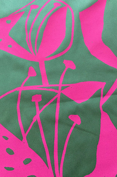 Why You'll Love It: Our Woodcut Flowers" print on Japanese oxford cotton in cerise on green is a bold and graphic design, hand screen printed here in Sydney.