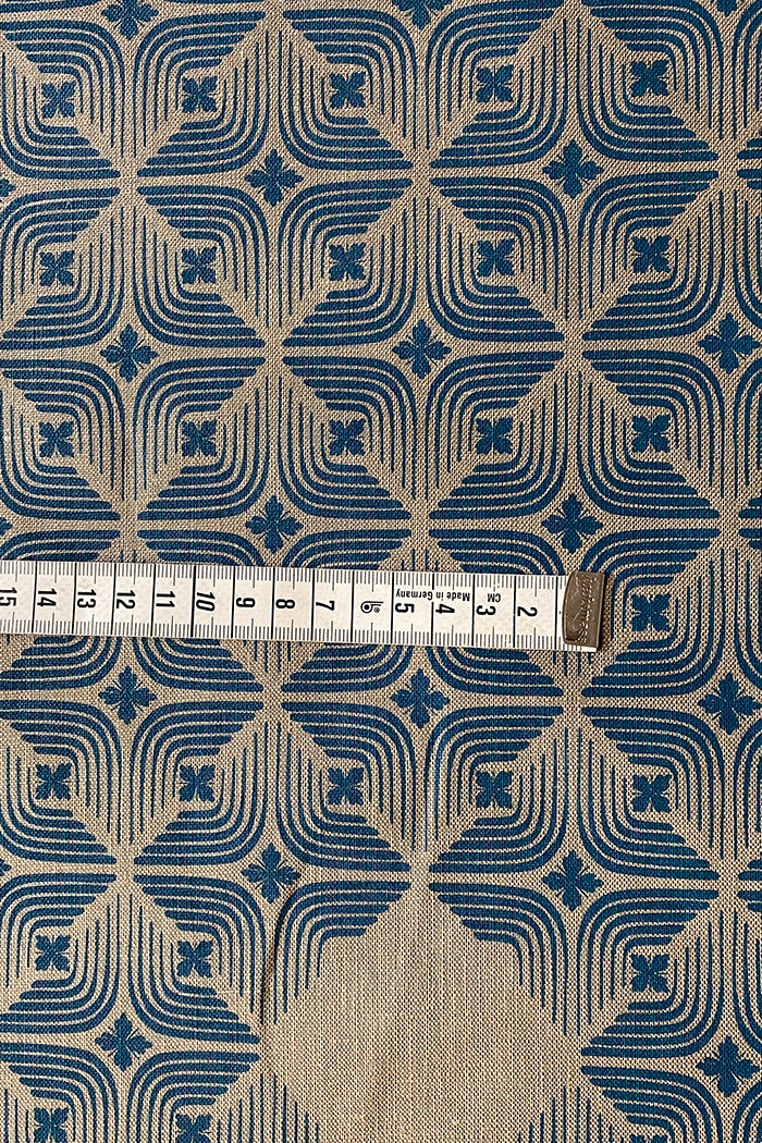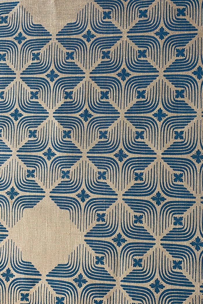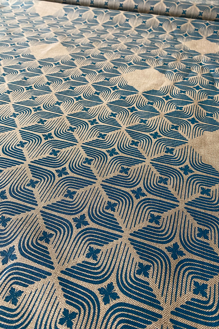 Why You'll Love It: Our original Kiku design in teal blue on flax shade of natural linen—versatile for clothing or interiors, screen printed in Sydney.