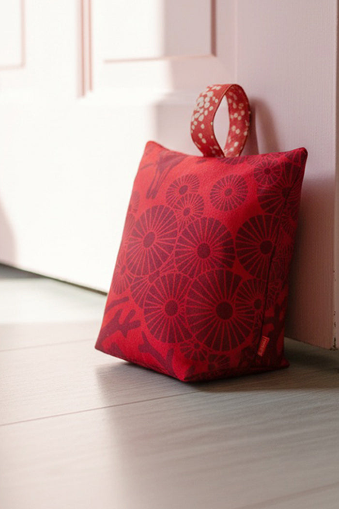 In a 100% cotton, is in our original hand screen printed design Mikko in berry on red, our doorstop is a handy item for any room. The doorstop has a zip closure at the bottom and the rice filling is bagged for easy removal.