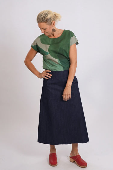 Hello to Amy, the new 70"s inspired long a-line, with a panel detail at the waist, finishing at the high hip, back zipper and with patch pockets, then falling to below the calf depending on your height.
