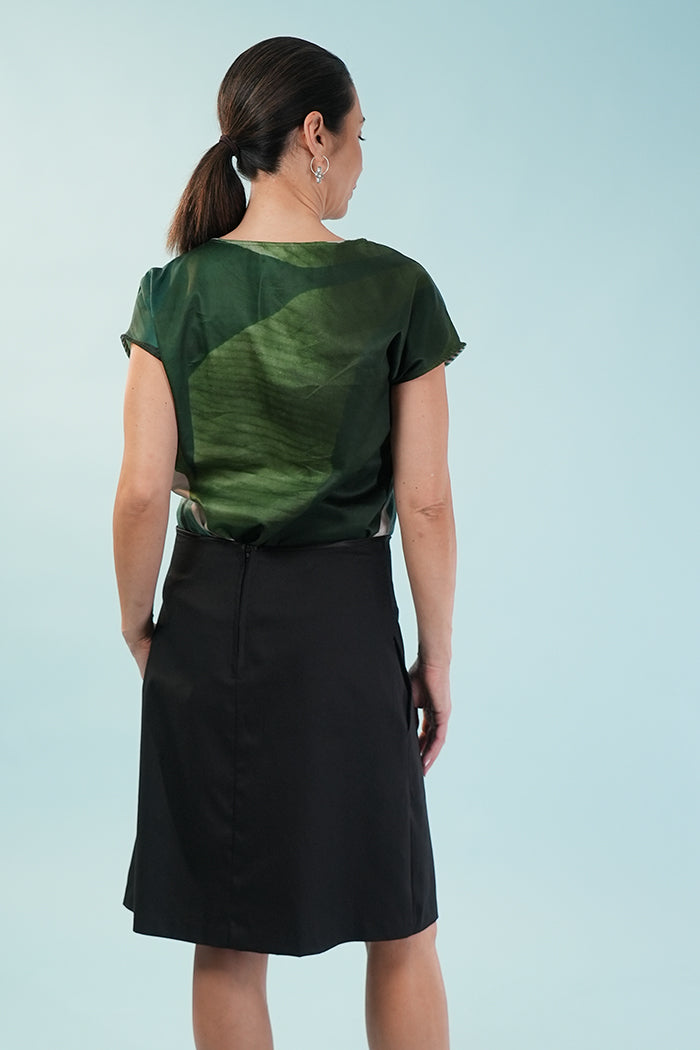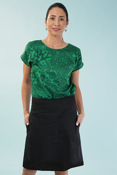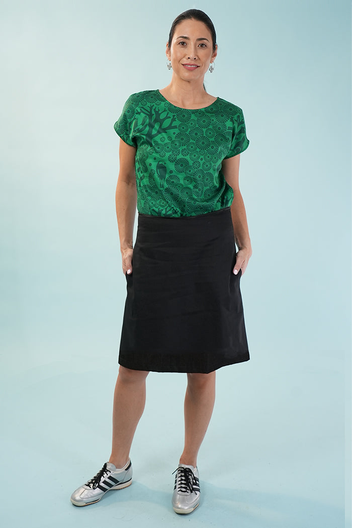 The Sandy Short Skirt is a modern seasonal staple. In plain black with a black satin binding at the waist, it’s designed with deep curved side pockets and a flattering A-line cut that finishes at the knee.