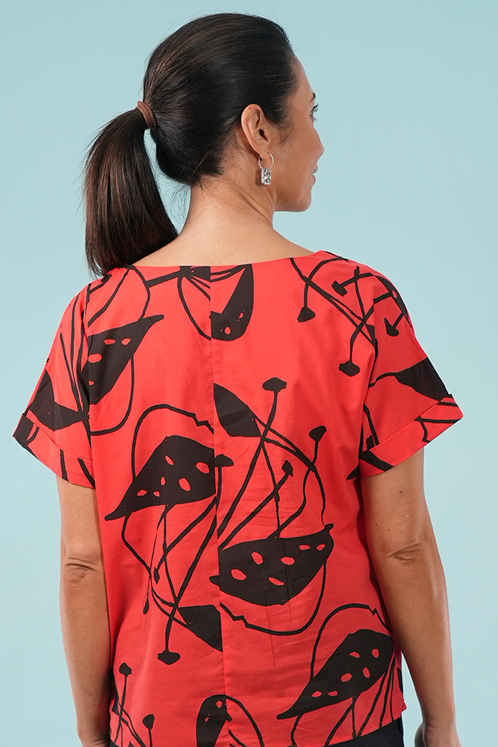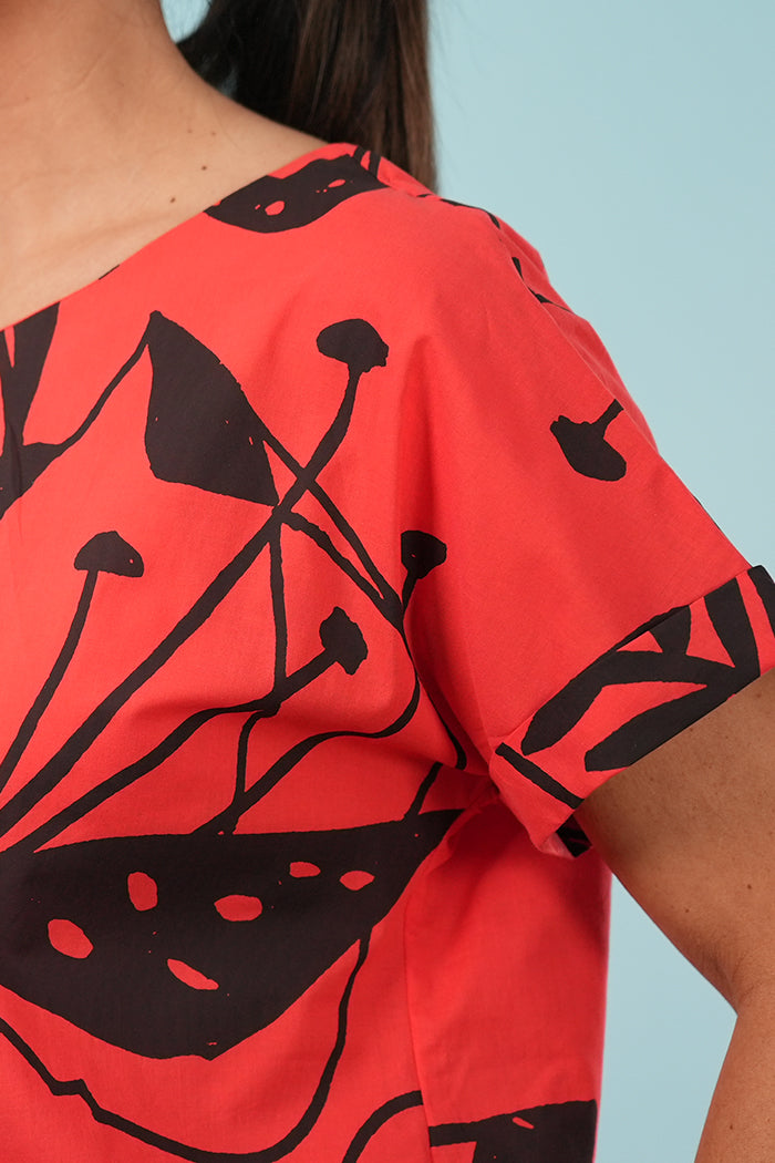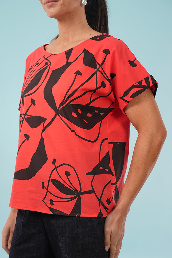 Bella Top - Woodcut Flowers in Black on Tangerine