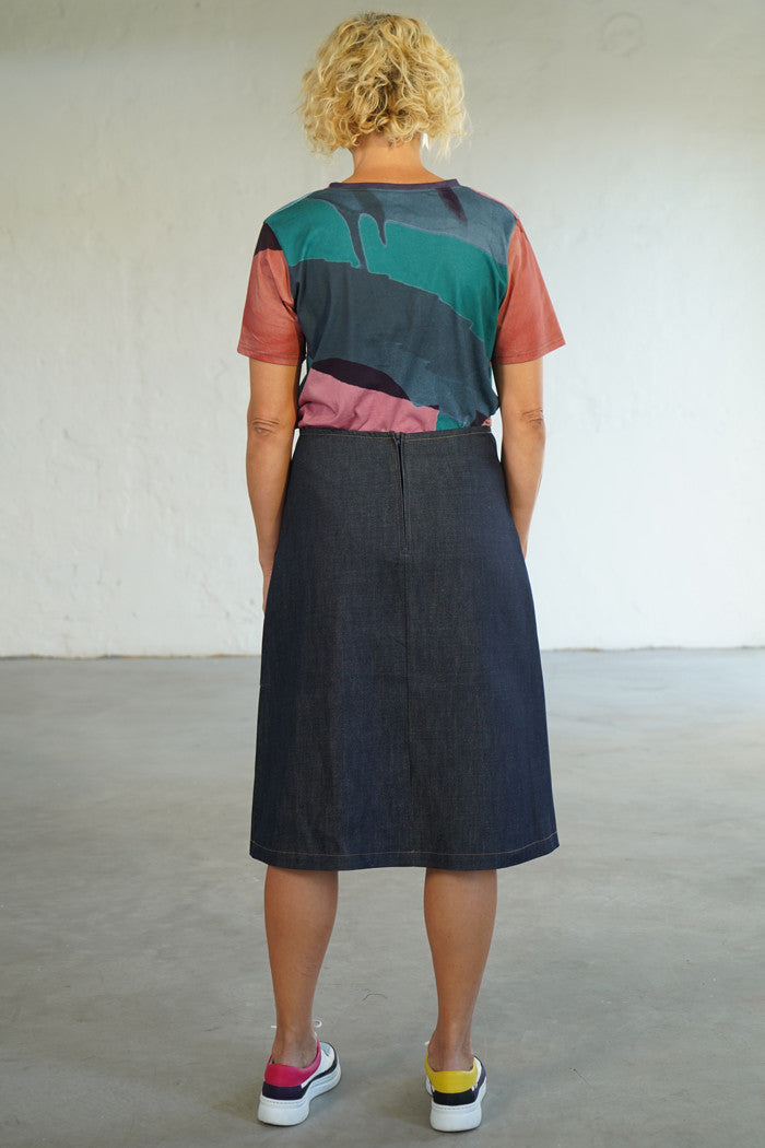 Our classic a-line skirt with patch pockets on the front and zipper at the back is now here in a mid-weight Indigo denim and has contrast "tan" top-stitching detail for that cute jean look. Great trans-seasonal skirt, wear with our any of our tops and tights in winter or sneakers in summer