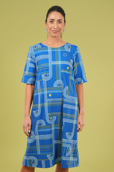 Made from soft, stretchy cotton jersey (95% cotton, 5% elastane), it features bust darts, mid-bicep sleeves, and side pockets for everyday ease.