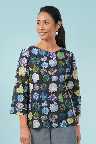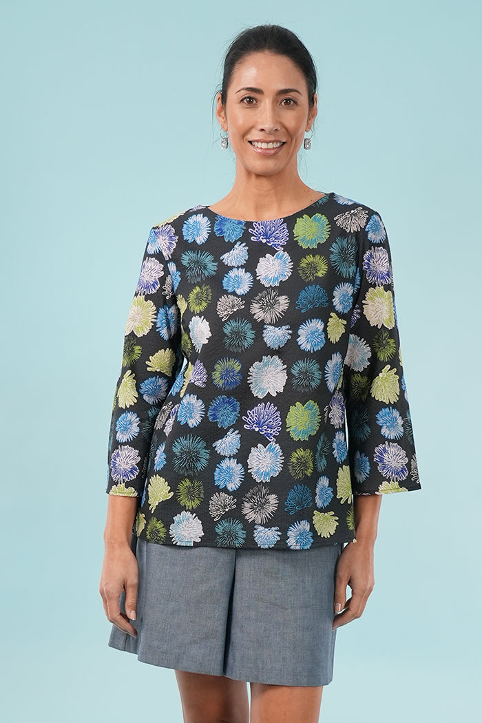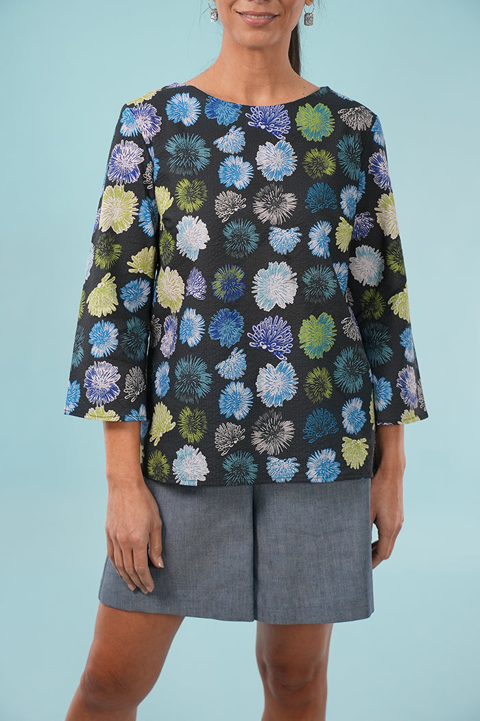 The Lori Top features a relaxed silhouette with ¾ drop sleeves, a boat neckline, and bust darts for subtle shaping. Cut from lightweight woven seersucker, featuring our original Summer Flowers print, digitally printed on a black ground with Australian native-inspired blooms in shades blues, greens and whites, adds gentle texture and visual interest.