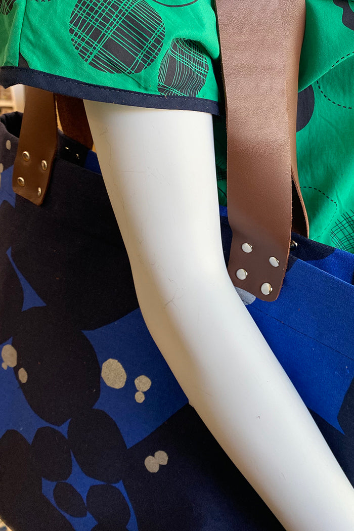 The Lucy Tote is designed to be your go‑to handmade tote bag for everyday life. Generous in size, it features a contrast lining, an inside pocket for essentials, and sturdy tan leather straps with rivet detailing. A magnetic snap closure adds ease and security, making this large shoulder bag both practical and stylish.