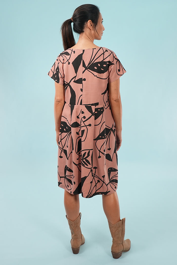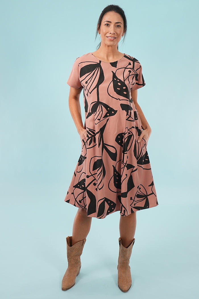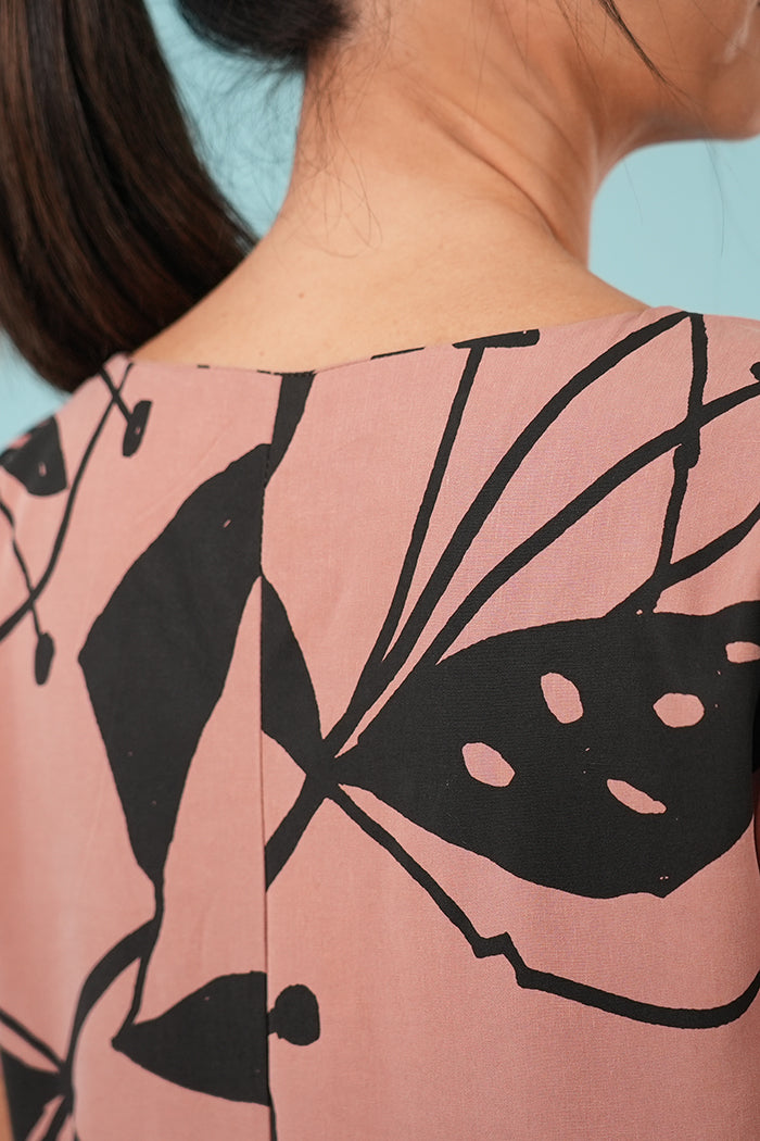 In a hand screen printed in Sydney in a gorgeous tencel / linen in black on a soft pink ground