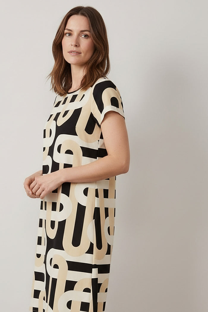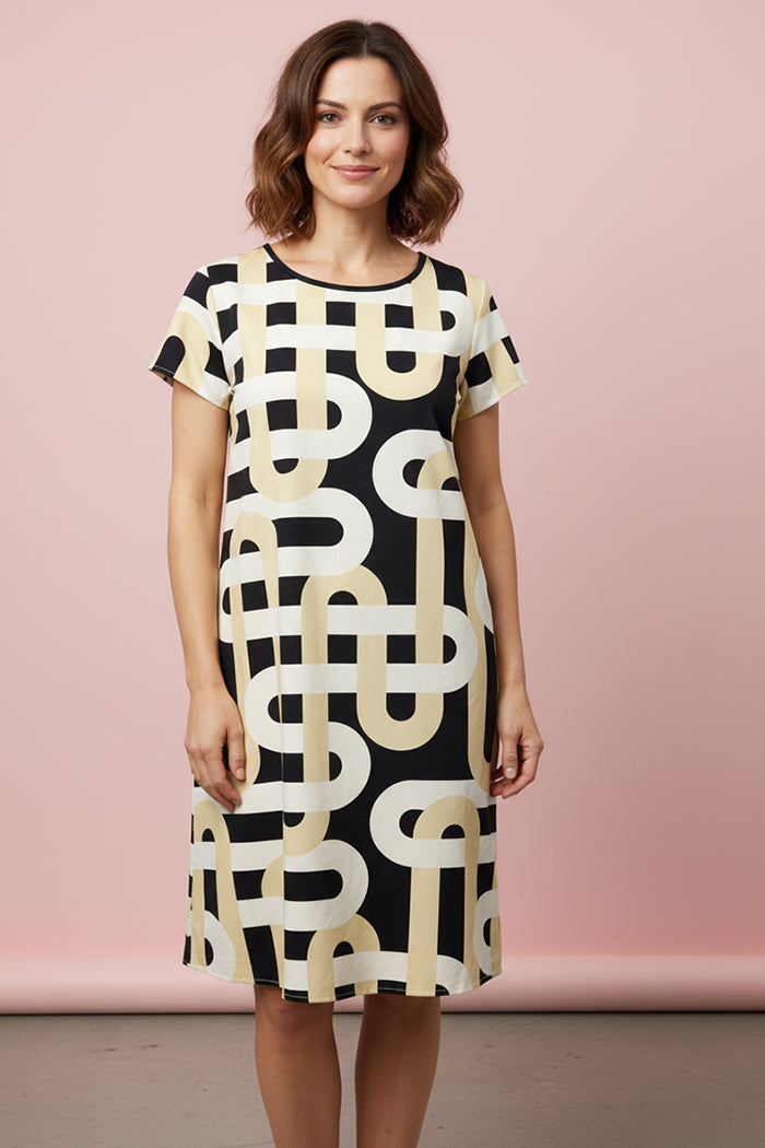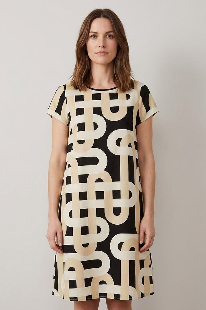 - Design: A-line swing shape, bust darts, side pockets, short sleeves, low round neckline, contrast binding.