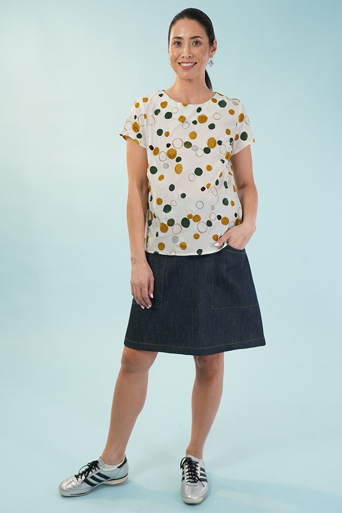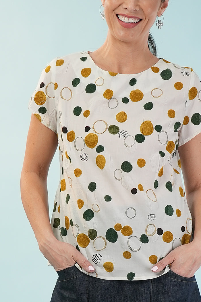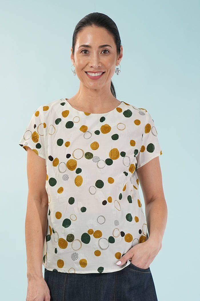 Our Shelley top is understated and simple, with a relaxed fit, bust darts, slight boat neckline, short sleeves with a keyhole and button detail at the back neck. The shelley top is effortlessly flattering, wear it with pants, shorts or your favourite skirt.. This is a perfect addition to your wardrobe