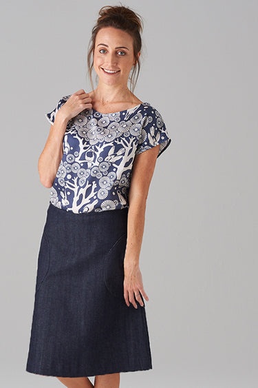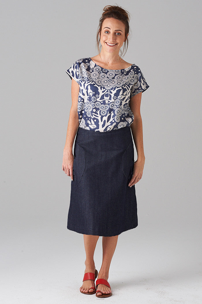 It's back, our Sandy a-line skirt in indigo denim. You'll love the generous side curved patch pockets, back zipper and we sure to become your go-to denim skirt